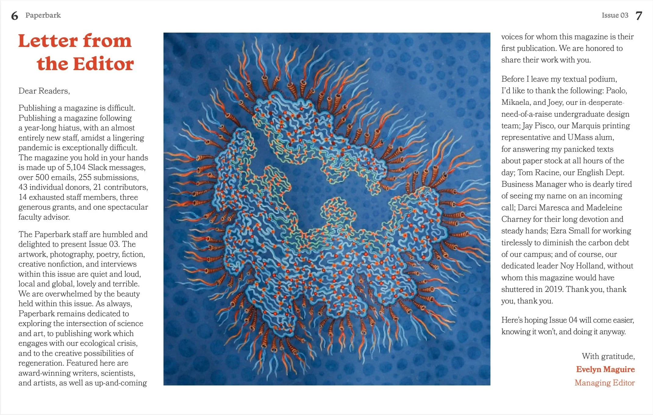 Paperbark Literary Magazine was brought back to life in the Fall of 2021 by a group of motivated graduate students at UMass Amherst. Looking to have more control over the design than in previous issues, the editorial board decided to hire a small team of three undergraduate design students to jumpstart their vision: Paolo Brandon, Mikaela Bowler, and me.